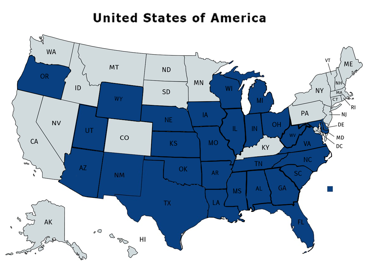 ALABAMA – ARIZONA – ARKANSAS – DELAWARE – FLORIDA – GEORGIA – ILLINOIS – INDIANA – LOWA – KANSAS – LOUISIANA – MARYLAND – MICHIGAN – MISSISIPPI – MISSOURI – NEBRASKA – NORTH CAROLINA – NUEVO MEXICO – OHIO – OKLAHOMA